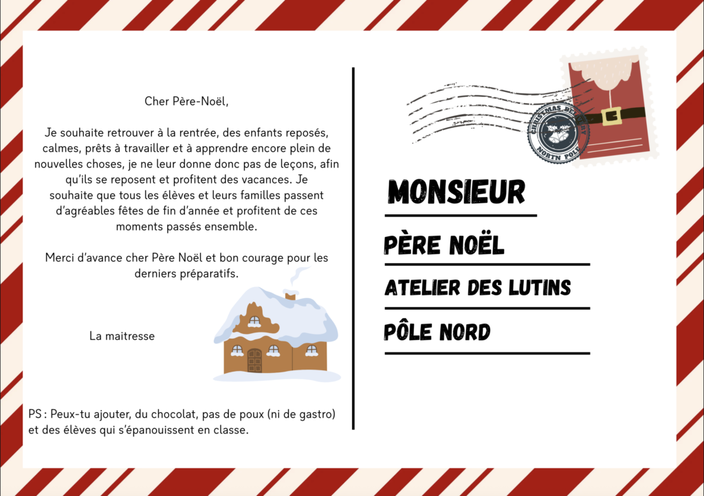Encore une fois, mille mercis. Après les devoirs façon sorcière, mes élèves vont profiter de la lettre au Père Noël pour leurs devoirs aux prochaines vacances. J’ai modifié quelques petites choses pour que cela corresponde au mieux à ma classe mais la trame fournie est déjà top !